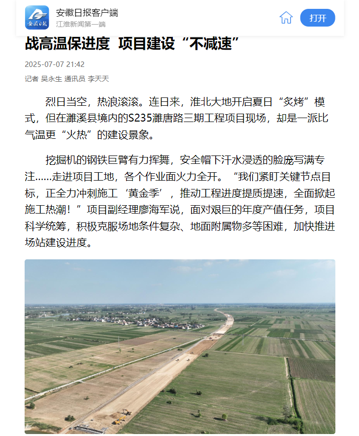 【名媒聚焦】安徽日?qǐng)?bào):S235濉唐路三期工程項(xiàng)目——戰(zhàn)高溫保進(jìn)度 項(xiàng)目建設(shè)“不減速”