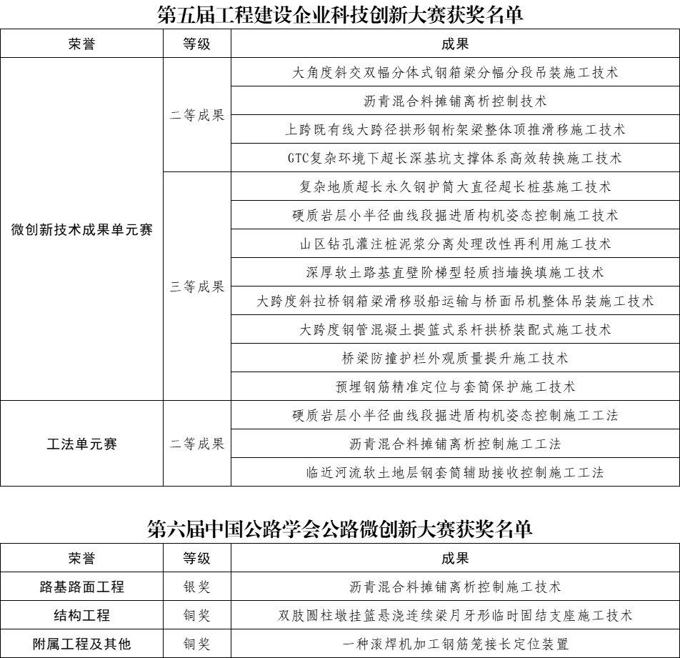 近日,中國公路學(xué)會(huì)與中國施工企業(yè)管理協(xié)會(huì)相繼公布了第六屆公路微創(chuàng)新大賽和第五屆工程建設(shè)企業(yè)科技創(chuàng)新大賽評選結(jié)果。公司在兩項(xiàng)國家級賽事中共獲18項(xiàng)獎(jiǎng)項(xiàng),其中,在微創(chuàng)新大賽中摘得銀獎(jiǎng)1項(xiàng)、銅獎(jiǎng)2項(xiàng),在科技創(chuàng)新大賽中榮獲二等成果7項(xiàng)、三等成果8項(xiàng)。