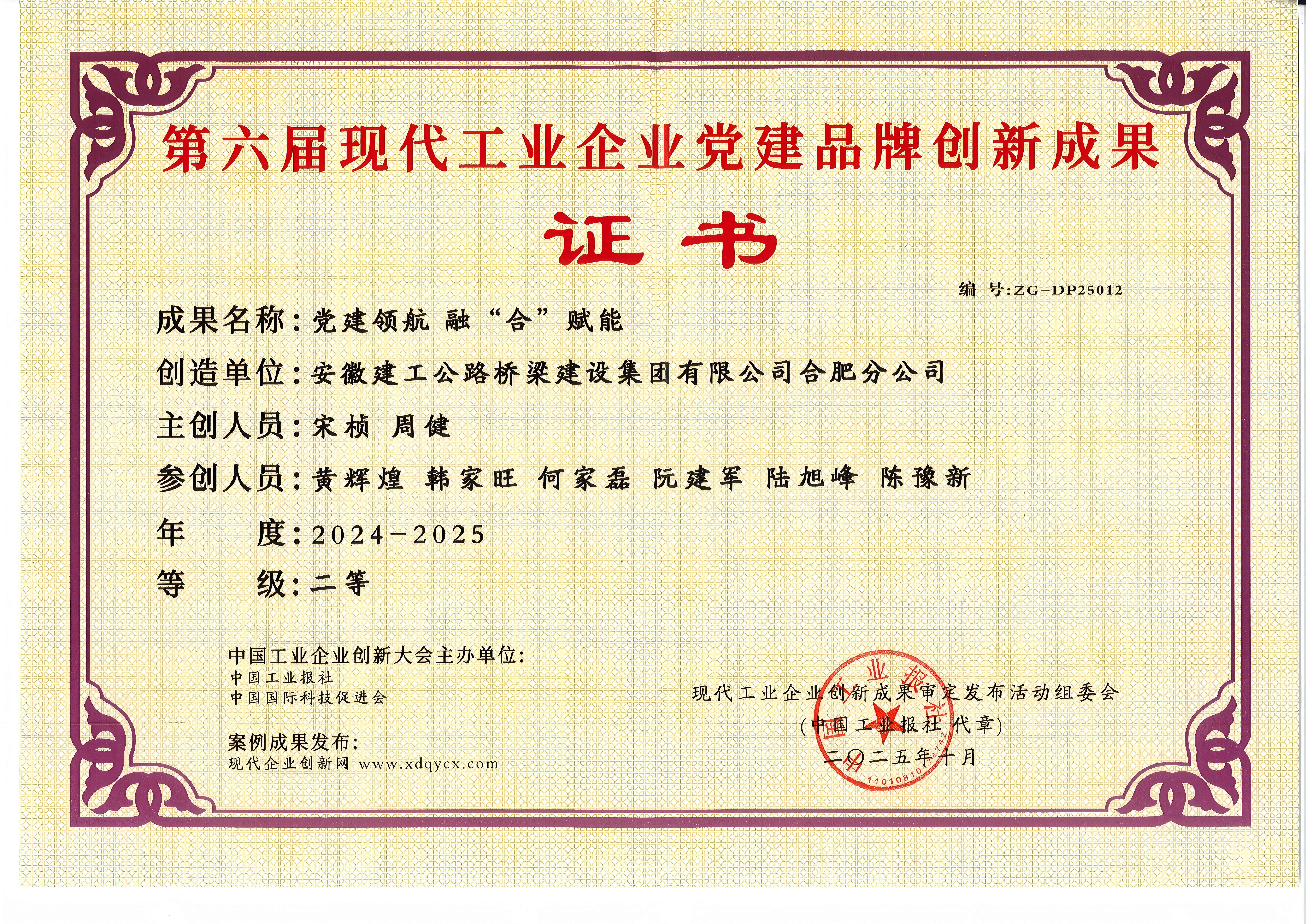 近日,第六屆現代工業(yè)企業(yè)黨建品牌創(chuàng)新成果評選結果正式發(fā)布,合肥分公司傾力打造的“黨建領航 融‘合’賦能”黨建品牌,憑借鮮明的創(chuàng)建特色、扎實的實踐成效與突出的創(chuàng)新價值,成功榮獲二等成果。